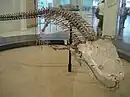 Many examples of species showing transitional features have been discovered. Ichthyostega was one of the first primitive amphibians, with nostrils and more efficient lungs. It had four sturdy limbs, a neck, a tail with fins and a skull very similar to that of the lobe-finned fish, Eusthenopteron.[21] Amphibians evolved adaptations that allowed them to stay out of the water for longer periods. Their lungs improved and their skeletons became heavier and stronger, better able to support the weight of their bodies on land. They developed "hands" and "feet" with five or more digits;[23] the skin became more capable of retaining body fluids and resisting desiccation.[22] The fish's hyomandibula bone in the hyoid region behind the gills diminished in size and became the stapes of the amphibian ear, an adaptation necessary for hearing on dry land.[24] An affinity between the amphibians and the teleost fish is the multi-folded structure of the teeth and the paired supra-occipital bones at the back of the head, neither of these features being found elsewhere in the animal kingdom.[25]