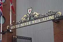 Floodlights were installed at a cost of £12,000 in 1957. On 30 October they were switched on for the first time for a match against Everton to commemorate the 75-year anniversary of the Liverpool County Football Association.[27] In 1963 the old Kemlyn Road stand was replaced by a cantilevered stand, built at a cost of £350,000, accommodating 6,700 spectators.[28] Two years later alterations were made at the Anfield Road end, turning it into a larger covered standing area with refreshments under the structure. The biggest redevelopment came in 1973, when the old Main Stand was partially demolished and extended backwards with new roof. Simultaneously the concrete pylon floodlights were demolished with new lights installed along the rooflines of the Kemlyn Road and Main Stands. The new stand was officially opened by the Duke of Kent on 10 March 1973.[28] In the 1980s the paddock in front of the Main Stand was turned into seating, and in 1982 seats were introduced at the Anfield Road end. The Shankly Gates were erected in 1982, a tribute to former manager Bill Shankly; his widow Nessie unlocked them for the first time on 26 August 1982.[20] Across the Shankly Gates are the words You'll Never Walk Alone, the title of the hit song by Gerry and the Pacemakers adopted by Liverpool fans as the club's anthem during Shankly's time as manager.[29]