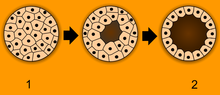 Nearly all animals make use of some form of sexual reproduction.[33] They produce haploid gametes by meiosis; the smaller, motile gametes are spermatozoa and the larger, non-motile gametes are ova.[34] These fuse to form zygotes,[35] which develop via mitosis into a hollow sphere, called a blastula. In sponges, blastula larvae swim to a new location, attach to the seabed, and develop into a new sponge.[36] In most other groups, the blastula undergoes more complicated rearrangement.[37] It first invaginates to form a gastrula with a digestive chamber and two separate germ layers, an external ectoderm and an internal endoderm.[38] In most cases, a third germ layer, the mesoderm, also develops between them.[39] These germ layers then differentiate to form tissues and organs.[40]