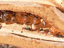 Nests may be protected from physical threats such as flooding and overheating by elaborate nest architecture.[112][113] Workers of Cataulacus muticus, an arboreal species that lives in plant hollows, respond to flooding by drinking water inside the nest, and excreting it outside.[114] Camponotus anderseni, which nests in the cavities of wood in mangrove habitats, deals with submergence under water by switching to anaerobic respiration.[115]