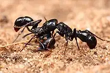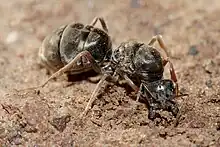 Drones can also mate with existing queens by entering a foreign colony, such as in army ants. When the drone is initially attacked by the workers, it releases a mating pheromone. If recognized as a mate, it will be carried to the queen to mate.[75] Males may also patrol the nest and fight others by grabbing them with their mandibles, piercing their exoskeleton and then marking them with a pheromone. The marked male is interpreted as an invader by worker ants and is killed.[76]