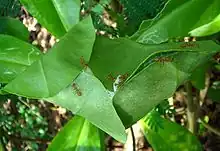 Weaver ant (Oecophylla spp.) workers build nests in trees by attaching leaves together, first pulling them together with bridges of workers and then inducing their larvae to produce silk as they are moved along the leaf edges. Similar forms of nest construction are seen in some species of Polyrhachis.[120]