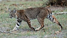 The bobcat is thought to have evolved from the Eurasian lynx (L. lynx), which crossed into North America by way of the Bering Land Bridge during the Pleistocene, with progenitors arriving as early as 2.6 million years ago.[20] It first appeared during the Irvingtonian stage around 1.8 million years ago. The first bobcat wave moved into the southern portion of North America, which was soon cut off from the north by glaciers; the population evolved into the modern bobcat around 20,000 years ago. A second population arrived from Asia and settled in the north, developing into the modern Canada lynx (L. canadensis).[21] Hybridization between the bobcat and the Canada lynx may sometimes occur.[22] The populations east and west of the Great Plains were probably separated during Pleistocene interglacial periods due to the aridification of the region.[23]