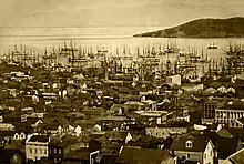 San Francisco had been a tiny settlement before the rush began. When residents learned about the discovery, it at first became a ghost town of abandoned ships and businesses,[18] but then boomed as merchants and new people arrived. The population of San Francisco increased quickly from about 1,000[19] in 1848 to 25,000 full-time residents by 1850.[20] Miners lived in tents, wood shanties, or deck cabins removed from abandoned ships.[21] There were no churches or religious services in the rapidly growing city, which prompted missionaries like William Taylor to meet the need, where he held services in the street, using a barrel head as his pulpit. Crowds would gather to listen to his sermons, and before long he received enough generous donations from successful gold miners and built San Francisco's first church.[22]