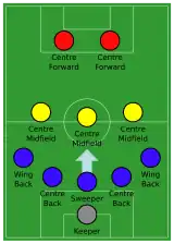 The sweeper (or libero) is a more versatile centre-back who "sweeps up" the ball if an opponent manages to breach the defensive line.[4][5] This position is rather more fluid than that of other defenders who man-mark their designated opponents. Because of this, it is sometimes referred to as libero, which is Italian for "free".[6][7]