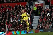 Edwin van der Sar, pictured playing for Manchester United during the 2010–11 season, is considered to be one of the pioneers of the sweeper-keeper role.