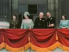 At the end of the war in Europe, on Victory in Europe Day, Elizabeth and Margaret mingled incognito with the celebrating crowds in the streets of London. In 1985, Elizabeth recalled in a rare interview, "... we asked my parents if we could go out and see for ourselves. I remember we were terrified of being recognised ... I remember lines of unknown people linking arms and walking down Whitehall, all of us just swept along on a tide of happiness and relief."[35][36]