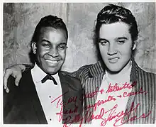 Presley, who could not read music, played by ear and frequented record stores that provided jukeboxes and listening booths. He knew all of Hank Snow's songs,[24] and he loved records by other country singers such as Roy Acuff, Ernest Tubb, Ted Daffan, Jimmie Rodgers, Jimmie Davis, and Bob Wills.[25] The Southern gospel singer Jake Hess, one of his favorite performers, was a significant influence on his ballad-singing style.[26][27] Presley was a regular audience member at the monthly, all-night singings downtown, where many of the white gospel groups that performed reflected the influence of African American spirituals.[28] Presley listened to regional radio stations, such as WDIA, that played what were then called "race records": spirituals, blues, and the modern, backbeat-heavy rhythm and blues.[29] Like some of his peers, he may have attended blues venues only on nights designated for exclusively white audiences.[30] Many of his future recordings were inspired by local African-American musicians such as Arthur Crudup and Rufus Thomas.[31][32] B.B. King recalled that he had known Presley before he was popular when they both used to frequent Beale Street.[33] By the time he graduated high school in June 1953, Presley had singled out music as his future.[34][35]