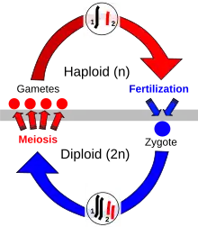Sexual reproduction requires a life cycle that alternates between a haploid phase, with one copy of each chromosome in the cell, and a diploid phase, with two copies. In eukaryotes, haploid gametes are produced by meiosis; two gametes fuse to form a diploid zygote.
