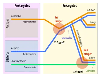 The eukaryotes emerged within the archaeal kingdom Promethearchaeati, and are closely related to the Heimdallarchaeia.[4] This implies that there are only two domains of life, Bacteria and Archaea, with eukaryotes incorporated among the Archaea. Eukaryotes first emerged during the Paleoproterozoic, likely as flagellated cells. The leading evolutionary theory is they were created by symbiogenesis between an anaerobic Asgard archaean and an aerobic proteobacterium, which formed the mitochondria. A second episode of symbiogenesis with a cyanobacterium created the plants, with chloroplasts.