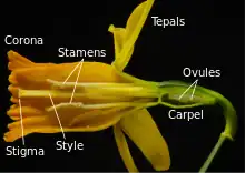 | Flowers | The reproductive organs of flowering plants, not found in any other seed plants.[9] | ![]() A Narcissus flower in section. Petals and sepals are replaced here by a fused tube, the corona, and tepals. |