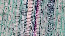 | Xylem made of vessel elements | Open vessel elements are stacked end to end to form continuous tubes, whereas gymnosperm xylem is made of tapered tracheids connected by small pits.[15] | ![]() Xylem vessels (long tubes). |