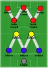 Attacking positions generally favour direct players who take on the defense of the opponent in order to create scoring chances, where they benefit from a lack of predictability in attacking play. Modern team formations normally include one to three forwards. For example, the common 4–2–3–1 includes one forward.[2] Less conventional formations may include more than three forwards, or sometimes none.[3][4]