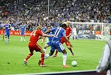 The term "target forward" or "target man" is often used to describe a particular type of striker or centre-forward whose main role is to win high balls in the air, hold up the ball, and create chances for other members of the team in addition to scoring goals themselves.[6] These players are usually tall and physically strong, adept at heading the ball, and capable of playing with their back to goal in the final third of the pitch. Some of the most high-profile examples of this type of players in modern football include Olivier Giroud and Fernando Llorente, both World Cup winners, with the former having played the entire tournament as a starting line-up forward tasked primarily with pressing, counter-pressing, winning high or loose balls, and providing key passes to quicker and more agile teammates, namely Antoine Griezmann or Kylian Mbappé. Another example of a striker who played in this position is Didier Drogba.[65][66][67] However, not any tall and/or physically strong player feels comfortable in the role of a "target man", despite having all the necessary features. Such forwards as Zlatan Ibrahimović, Romelu Lukaku, and Erling Haaland have all rejected the term when applied to specifically them, with Ibrahimović preferring to be described as an attacking all-rounder, while Lukaku and Haaland have said to favour poaching goals rather than physical play.[68]