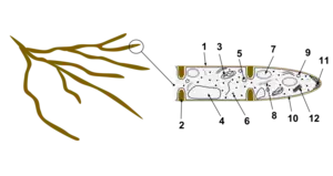 Most fungi grow as hyphae, which are cylindrical, thread-like structures 2–10 μm in diameter and up to several centimeters in length. Hyphae grow at their tips (apices); new hyphae are typically formed by emergence of new tips along existing hyphae by a process called branching, or occasionally growing hyphal tips fork, giving rise to two parallel-growing hyphae.[60] Hyphae also sometimes fuse when they come into contact, a process called hyphal fusion (or anastomosis). These growth processes lead to the development of a mycelium, an interconnected network of hyphae.[34] Hyphae can be either septate or coenocytic. Septate hyphae are divided into compartments separated by cross walls (internal cell walls, called septa, that are formed at right angles to the cell wall giving the hypha its shape), with each compartment containing one or more nuclei; coenocytic hyphae are not compartmentalized.[61] Septa have pores that allow cytoplasm, organelles, and sometimes nuclei to pass through; an example is the dolipore septum in fungi of the phylum Basidiomycota.[62] Coenocytic hyphae are in essence multinucleate supercells.[63]
