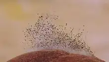 Specialized mechanical and physiological mechanisms, as well as spore surface structures (such as hydrophobins), enable efficient spore ejection.[104] For example, the structure of the spore-bearing cells in some ascomycete species is such that the buildup of substances affecting cell volume and fluid balance enables the explosive discharge of spores into the air.[105] The forcible discharge of single spores termed ballistospores involves formation of a small drop of water (Buller's drop), which upon contact with the spore leads to its projectile release with an initial acceleration of more than 10,000 g;[106] the net result is that the spore is ejected 0.01–0.02 cm, sufficient distance for it to fall through the gills or pores into the air below.[107] Other fungi, like the puffballs, rely on alternative mechanisms for spore release, such as external mechanical forces. The hydnoid fungi (tooth fungi) produce spores on pendant, tooth-like or spine-like projections.[108] The bird's nest fungi use the force of falling water drops to liberate the spores from cup-shaped fruiting bodies.[109] Another strategy is seen in the stinkhorns, a group of fungi with lively colors and putrid odor that attract insects to disperse their spores.[110]