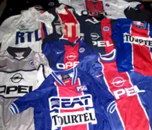 Shirts are normally made of a polyester mesh, which does not trap the sweat and body heat in the same way as a shirt made of a natural fibre.[10] Most professional clubs have sponsors' logos on the front of their shirts, which can generate significant levels of income,[11] and some also offer sponsors the chance to place their logos on the back of their shirts.[12] Depending on local rules, there may be restrictions on how large these logos may be or on what logos may be displayed.[13] Competitions such as the Premier League may also require players to wear patches on their sleeves depicting the logo of the competition.[14] A player's number is usually printed on the back of the shirt, although international teams often also place numbers on the front,[15] and professional teams generally print a player's surname above their number.[16] The captain of each team is usually required to wear an elasticated armband around the left sleeve to identify them as the captain to the referee and supporters.