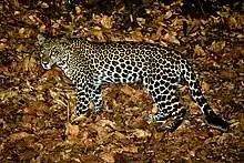 In the Indian subcontinent, the leopard is still relatively abundant, with greater numbers than those of other Panthera species.[1] Some leopard populations in India live quite close to human settlements and even in semi-developed areas. Although adaptable to human disturbances, leopards require healthy prey populations and appropriate vegetative cover for hunting for prolonged survival and thus rarely linger in heavily developed areas. Due to the leopard's stealth, people often remain unaware that it lives in nearby areas.[90] As of 2020, the leopard population within forested habitats in India's tiger range landscapes was estimated at 12,172 to 13,535 individuals. Surveyed landscapes included elevations below 2,600 m (8,500 ft) in the Shivalik Hills and Gangetic plains, Central India and Eastern Ghats, Western Ghats, the Brahmaputra River basin and hills in Northeast India.[91] In Nepal's Kanchenjunga Conservation Area, a melanistic leopard was photographed at an elevation of 4,300 m (14,100 ft) by a camera trap in May 2012.[92]