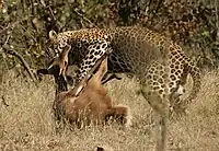 - ↑ Hayward, M.W.; Henschel, P.; O'Brien, J.; Hofmeyr, M.; Balme, G. & Kerley, G. I. H. (2006). "Prey preferences of the leopard (Panthera pardus)" (PDF). Journal of Zoology. 270 (4): 298–313. doi:10.1111/j.1469-7998.2006.00139.x. Archived (PDF) from the original on 2012-11-05.