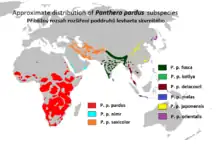 | African leopard (P. p. pardus) (Linnaeus, 1758)[2] | It is the most widespread leopard subspecies and is native to most of Sub-Saharan Africa, but likely locally extinct in Mauritania, Togo, Morocco, Algeria, Tunisia and Libya and most likely also in Gambia and Lesotho.[1] | ![]() |