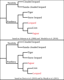 Results of phylogenetic studies based on nuclear DNA and mitochondrial DNA analysis showed that the last common ancestor of the Panthera and Neofelis genera is thought to have lived about 6.37 million years ago. Neofelis diverged about 8.66 million years ago from the Panthera lineage. The tiger diverged about 6.55 million years ago, followed by the snow leopard about 4.63 million years ago and the leopard about 4.35 million years ago. The leopard is a sister taxon to a clade within Panthera, consisting of the lion and the jaguar.[36][37]