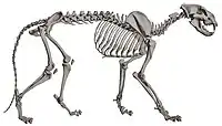 The Panthera lineage is estimated to have genetically diverged from the common ancestor of the Felidae around 9.32 to 4.47 million years ago to 11.75 to 0.97 million years ago.[6][32][33] Results of analyses differ in the phylogenetic relationship of the lion; it was thought to form a sister group with the jaguar that diverged 3.46 to 1.22 million years ago,[6] but also with the leopard that diverged 3.1 to 1.95 million years ago[8][9] to 4.32 to 0.02 million years ago. Hybridisation between lion and snow leopard ancestors possibly continued until about 2.1 million years ago.[33] The lion-leopard clade was distributed in the Asian and African Palearctic since at least the early Pliocene.[34] The earliest fossils recognisable as lions were found at Olduvai Gorge in Tanzania and are estimated to be up to 2 million years old.[32]