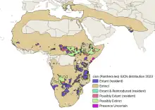 - ↑ Bauer, H.; Van Der Merwe, S. (2004). "Inventory of free-ranging lions Panthera leo in Africa". Oryx. 38 (1): 26–31. doi:10.1017/S0030605304000055.