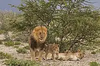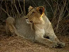 In the 19th and 20th centuries, several lion type specimens were described and proposed as subspecies, with about a dozen recognised as valid taxa until 2017.[2] Between 2008 and 2016, IUCN Red List assessors used only two subspecific names: P. l. leo for African lion populations, and P. l. persica for the Asiatic lion population.[1][12][13] In 2017, the Cat Classification Task Force of the Cat Specialist Group revised lion taxonomy, and recognises two subspecies based on results of several phylogeographic studies on lion evolution, namely:[14]