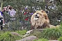 The male lion's mane is the most recognisable feature of the species.[11] It may have evolved around 320,000–190,000 years ago.[62] It grows downwards and backwards, covering most of the head, neck, shoulders, and chest. The mane is typically brownish and tinged with yellow, rust, and black hairs.[45] Mutations in the genes microphthalmia-associated transcription factor and tyrosinase are possibly responsible for the colour of manes.[63][64] It starts growing when lions enter adolescence, when testosterone levels increase, and reach their full size at around four years old.[65] Cool ambient temperatures in European and North American zoos may result in a heavier mane.[66] On average, Asiatic lions have sparser manes than African lions.[67]