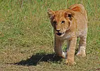 Nomadic lions range widely and move around sporadically, either in pairs or alone.[97] Pairs are more frequent among related males. A lion may switch lifestyles; nomads can become residents and vice versa.[103] Interactions between prides and nomads tend to be hostile, although pride females in estrus allow nomadic males to approach them.[104] Males spend years in a nomadic phase before gaining residence in a pride.[105] A study undertaken in the Serengeti National Park revealed that nomadic coalitions gain residency at between 3.5 and 7.3 years of age.[106] In Kruger National Park, dispersing male lions move more than 25 km (16 mi) away from their natal pride in search of their own territory. Female lions stay closer to their natal pride. Therefore, female lions in an area are more closely related to each other than male lions in the same area.[107]