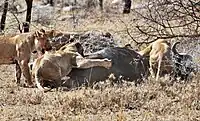 The lion is a generalist hypercarnivore and is considered to be both an apex and keystone predator due to its wide prey spectrum.[116][117] Its prey consists mainly of medium-sized to large ungulates, particularly blue wildebeest, plains zebra, African buffalo, gemsbok and giraffe. It also frequently takes common warthog despite it being much smaller.[118] In India, chital and sambar deer are the most common wild prey,[45][118][119] while livestock contributes significantly to lion kills outside protected areas.[120] It usually avoids fully grown adult elephants, rhinoceros and hippopotamus and small prey like dik-dik, hyraxes, hares and monkeys. Unusual prey include porcupines and small reptiles. Lions kill other predators but seldom consume them.[121]