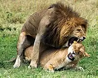 Most lionesses reproduce by the time they are four years of age.[158] Lions do not mate at a specific time of year and the females are polyestrous.[159] Like those of other cats, the male lion's penis has spines that point backward. During withdrawal of the penis, the spines rake the walls of the female's vagina, which may cause ovulation.[160][161] A lioness may mate with more than one male when she is in heat.[162] Lions of both sexes may be involved in group homosexual and courtship activities. Males will also head-rub and roll around with each other before mounting each other.[163][164] Generation length of the lion is about seven years.[165] The average gestation period is around 110 days;[159] the female gives birth to a litter of between one and four cubs in a secluded den, which may be a thicket, a reed-bed, a cave, or some other sheltered area, usually away from the pride. She will often hunt alone while the cubs are still helpless, staying relatively close to the den.[166] Lion cubs are born blind, their eyes opening around seven days after birth. They weigh 1.2–2.1 kg (2.6–4.6 lb) at birth and are almost helpless, beginning to crawl a day or two after birth and walking around three weeks of age.[167] To avoid a buildup of scent attracting the attention of predators, the lioness moves her cubs to a new den site several times a month, carrying them one-by-one by the nape of the neck.[166]