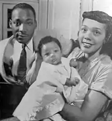 Michael King Jr. was born on January 15, 1929, in Atlanta; he was the second of three children born to Michael King Sr. and Alberta King (née Williams).[6][7][8] Alberta's father, Adam Daniel Williams,[9] was a minister in rural Georgia, moved to Atlanta in 1893,[8] and became pastor of the Ebenezer Baptist Church in the following year.[10] Williams married Jennie Celeste Parks.[8] Michael Sr. was born to sharecroppers James Albert and Delia King of Stockbridge, Georgia;[7][8] he was of Irish and likely Mende (Sierra Leone) descent.[11][12][13] As an adolescent, Michael Sr. left his parents' farm and walked to Atlanta, where he attained a high school education,[14][15][16] and enrolled in Morehouse College to study for entry to the ministry.[16] Michael Sr. and Alberta began dating in 1920, and married on November 25, 1926.[17][18] Until Jennie's death in 1941, their home was on the second floor of Alberta's parents' Victorian house, where King was born.[19][17][18][20] Michael Jr. had an older sister, Christine King Farris, and a younger brother, Alfred Daniel "A. D." King.[21]