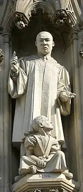 Shortly after marrying Alberta, Michael King Sr. became assistant pastor of the Ebenezer church.[18] Senior pastor Williams died in the spring of 1931[18] and that fall Michael Sr. took the role. With support from his wife, he raised attendance from six hundred to several thousand.[8][18][22] In 1934, the church sent King Sr. on a multinational trip; one of the stops on the trip was Berlin for the Congress of the Baptist World Alliance (BWA).[23] He also visited sites in Germany that are associated with the Reformation leader Martin Luther.[23] In reaction to the rise of Nazism, the BWA adopted a resolution saying, "This Congress deplores and condemns as a violation of the law of God the Heavenly Father, all racial animosity, and every form of oppression or unfair discrimination toward the Jews, toward colored people, or toward subject races in any part of the world."[24] After returning home in August 1934, Michael Sr. changed his name to Martin Luther King Sr. and his five-year-old son's name to Martin Luther King Jr.[23][25][17][a]