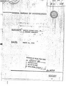 - ↑ Martin Luther King Jr.: The FBI Files. Filiquarian Publishing. 2007. pp. 40–42. ISBN 978-1-59986-253-8. See also: Polk, James (April 7, 2008). "King conspiracy theories still thrive 40 years later". CNN. Archived from the original on November 10, 2012. Retrieved June 16, 2008. and "King's FBI file Part 1 of 2" (PDF). FBI. Retrieved January 16, 2012. and "King's FBI file Part 2 of 2" (PDF). FBI. Retrieved January 16, 2012.