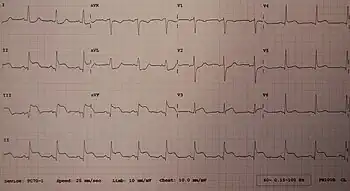ECG readouts produce a waveform with different labeled features.[87] In addition to a rise in biomarkers, a rise in the ST segment, changes in the shape or flipping of T waves, new Q waves, or a new left bundle branch block can be used to diagnose an AMI.[24] In addition, ST elevation can be used to diagnose an ST segment myocardial infarction (STEMI). A rise must be new in V2 and V3 ≥2 mm (0,2 mV) for males or ≥1.5 mm (0.15 mV) for females or ≥1 mm (0.1 mV) in two other adjacent chest or limb leads.[19][24] ST elevation is associated with infarction, and may be preceded by changes indicating ischemia, such as ST depression or inversion of the T waves.[87] Abnormalities can help differentiate the location of an infarct, based on the leads that are affected by changes.[16] Early STEMIs may be preceded by peaked T waves.[19] Other ECG abnormalities relating to complications of acute myocardial infarctions may also be evident, such as atrial or ventricular fibrillation.[88]