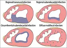 Cells in the area with the worst blood supply, just below the inner surface of the heart (endocardium), are most susceptible to damage.[77][78] Ischemia first affects this region, the subendocardial region, and tissue begins to die within 15–30 minutes of loss of blood supply.[79] The dead tissue is surrounded by a zone of potentially reversible ischemia that progresses to become a full-thickness transmural infarct.[76][79] The initial "wave" of infarction can take place over 3–4 hours.[73][76] These changes are seen on gross pathology and cannot be predicted by the presence or absence of Q waves on an ECG.[78] The position, size and extent of an infarct depends on the affected artery, totality of the blockage, duration of the blockage, the presence of collateral blood vessels, oxygen demand, and success of interventional procedures.[28][72]