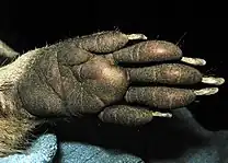 The most important sense for the raccoon is its sense of touch.[109][110][111] The "hyper sensitive"[110] front paws are protected by a thin horny layer that becomes pliable when wet.[112][113] The five digits of the paws have no webbing between them, which is unusual for a carnivoran.[114] Almost two-thirds of the area responsible for sensory perception in the raccoon's cerebral cortex is specialized for the interpretation of tactile impulses, more than in any other studied animal.[115] They are able to identify objects before touching them with vibrissae located above their sharp, nonretractable claws.[90][111] The raccoon's paws lack an opposable thumb; thus, it does not have the agility of the hands of primates.[111][113] There is no observed negative effect on tactile perception when a raccoon stands in water below 10 °C (50 °F) for hours.[116]