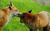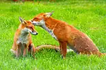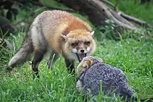Red foxes are usually found in pairs or small groups consisting of families, such as a mated pair and their young, or a male with several females having kinship ties. The young of the mated pair remain with their parents to assist in caring for new kits.[9] The species primarily feeds on small rodents, though it may also target rabbits, squirrels, game birds, reptiles, invertebrates[7] and young ungulates.[7] Fruit and vegetable matter is also eaten sometimes.[10] Although the red fox tends to kill smaller predators, including other fox species, it is vulnerable to attack from larger predators, such as wolves, coyotes, golden jackals, large predatory birds such as golden eagles and Eurasian eagle owls,[11] and medium- and large-sized felids.[12]