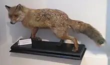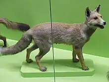 The species is Eurasian in origin, and may have evolved from either Vulpes alopecoides or the related Chinese V. chikushanensis, both of which lived during the Middle Villafranchian of the Pleistocene Epoch.[19] The earliest fossil specimens of V. vulpes were uncovered in Baranya County, Hungary, dating from 3.4 to 1.8 million years ago.[20] The ancestral red fox was likely more diminutive compared to today's extant foxes, as the earliest red fox fossils have shown a smaller build than living specimens.[19]: 115–116 The earliest fossil remains of the modern species date back to the mid-Pleistocene,[21] found in association with middens and refuse left by early human settlements. This has led to the theory that the red fox was hunted by primitive humans (as both a source of food and pelts); the possibility also exists of red foxes scavenging from middens or butchered animal carcasses.[22]
