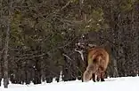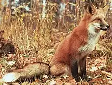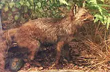 Red foxes colonised the North American continent in two waves: before and during the Illinoian glaciation, and during the Wisconsinan glaciation.[23] Gene mapping demonstrates that red foxes in North America have been isolated from their Old World counterparts for over 400,000 years, thus raising the possibility that speciation has occurred, and that the previous binomial name of Vulpes fulva may be valid.[24] In the far north, red fox fossils have been found in Sangamonian Stage deposits near the Fairbanks District, Alaska, and Medicine Hat, Alberta. Fossils dating from the Wisconsinan are present in 25 sites across Arkansas, California, Colorado, Idaho, Missouri, New Mexico, Ohio,[25] Tennessee, Texas, Virginia, and Wyoming. Although they ranged far south during the Wisconsinan, the onset of warm conditions shrank their range toward the north, and they have only recently reclaimed their former North American ranges because of human-induced environmental changes.[26] Genetic testing indicates that two distinct red fox refugia exist in North America, which have been separated since the Wisconsinan. The northern (or boreal) refugium occurs in Alaska and western Canada, and consists of the larger subspecies V. v. alascensis, V. v. abietorum, V. v. regalis, and V. v. rubricosa. The southern (or montane) refugium occurs in the subalpine parklands and alpine meadows of the west, from the Rocky Mountains to the Cascades and the Sierra Nevada ranges, consisting of the smaller subspecies V. v. cascadensis, V. v. macroura, V. v. necator, and V. v. patwin. The latter clade has been separated from all other red fox populations since at least the last glacial maximum, and may possess unique ecological or physiological adaptations.[23]