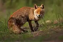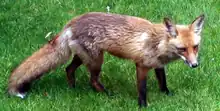 The red fox (Vulpes vulpes) is the largest of the true foxes and one of the most widely distributed members of the order Carnivora, being present across the entire Northern Hemisphere including most of North America, Europe and Asia, plus parts of North Africa. It is listed as least concern on the IUCN Red List.[1] Its range has increased alongside human expansion, having been introduced to Australia, where it is considered harmful to native small and medium-sized rodents and marsupials. Due to its impact on native species, it is included on the list of the "world's 100 worst invasive species".[4]