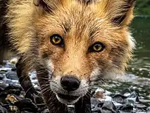 Although European foxes (V. v. crucigera) were introduced to portions of the United States in the 1900s, recent genetic investigation indicates an absence of European fox mitochondrial haplotypes in any North American populations.[27] Additionally, introduced eastern North American red foxes have colonised most of inland California, from Southern California to the San Joaquin Valley, Monterey and north-coastal San Francisco Bay Area (including urban San Francisco and adjacent cities). In spite of the red fox's adaptability to city life, they are still found in somewhat greater numbers in the northern portions of California (north of the Bay Area) than in the south, as the wilderness is more alpine and isolated. The eastern red foxes appear to have mixed with the Sacramento Valley red fox (V. v. patwin) only in a narrow hybrid zone.[28] In addition, no evidence is seen of interbreeding of eastern American red foxes in California with the montane Sierra Nevada red fox (V. v. necator) or other populations in the Intermountain West (between the Rocky Mountains to the east and the Cascade and Sierra Nevada Mountains to the west).[29]