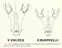 The sister lineage to the red fox is the Rüppell's fox, but the two species are surprisingly closely related through mitochondrial DNA markers, with Rüppell's fox nested inside the lineages of red foxes.[16][17] Such a nesting of one species within another is called paraphyly. Several hypotheses have been suggested to explain this,[16] including (1) recent divergence of Rüppell's fox from a red fox lineage, (2) incomplete lineage sorting, or introgression of mtDNA between the two species. Based on fossil record evidence, the last scenario seems most likely, which is further supported by the clear ecological and morphological differences between the two species.