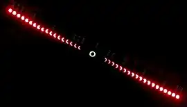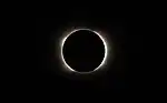 • Second contact—starting with Baily's Beads (caused by light shining through valleys on the Moon's surface) and the diamond ring effect. Almost the entire disk is covered.
