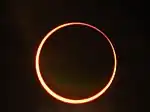 An annular eclipse, like a total eclipse, occurs when the Sun and Moon are exactly in line with Earth. During an annular eclipse, however, the apparent size of the Moon is not large enough to completely block out the Sun.[6] Totality thus does not occur; the Sun instead appears as a very bright ring, or annulus, surrounding the dark disk of the Moon.[6] Annular eclipses occur once every one or two years, not annually.[11][14] The term derives from the Latin root word anulus, meaning "ring", rather than annus, for "year".[14]