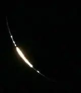A hybrid eclipse occurs when the magnitude of an eclipse changes during the event from less to greater than one, so the eclipse appears to be total at locations nearer the midpoint, and annular at other locations nearer the beginning and end, since the sides of Earth are slightly further away from the Moon. These eclipses are extremely narrow in their path width and relatively short in their duration at any point compared with fully total eclipses; the 2023 April 20 hybrid eclipse's totality is over a minute in duration at various points along the path of totality. Like a focal point, the width and duration of totality and annularity are near zero at the points where the changes between the two occur.[16]