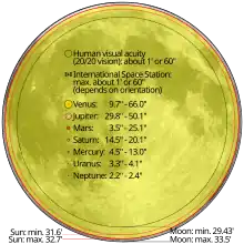 The Sun's distance from Earth is about 400 times the Moon's distance, and the Sun's diameter is about 400 times the Moon's diameter. Because these ratios are approximately the same, the Sun and the Moon as seen from Earth appear to be approximately the same size: about 0.5 degree of arc in angular measure.[6]
