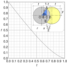 Fraction of the Sun's disc covered, f, when the same-sized discs are offset a fraction t of their diameter.[30]