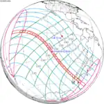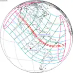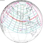 Central eclipse is often used as a generic term for a total, annular, or hybrid eclipse.[17] This is, however, not completely correct: the definition of a central eclipse is an eclipse during which the central line of the umbra touches Earth's surface. It is possible, though extremely rare, that part of the umbra intersects with Earth (thus creating an annular or total eclipse), but not its central line. This is then called a non-central total or annular eclipse.[17] Gamma is a measure of how centrally the shadow strikes. The last (umbral yet) non-central solar eclipse was on April 29, 2014. This was an annular eclipse. The next non-central total solar eclipse will be on April 9, 2043.[18]
